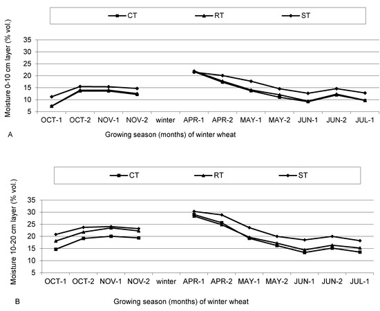 The basic soil tillage, fertilisation, and sowing technology affected the soil moisture throughout the winter wheat growing season (Figure 4). On average, in the research years the soil moisture in the 0–10 cm and 10–20 cm layers in the field of winter wheat grown following the ST was higher than CT and RT. Right after winter, the water content in soil was the highest and only in that period it did not depend on the soil tillage and sowing technology.