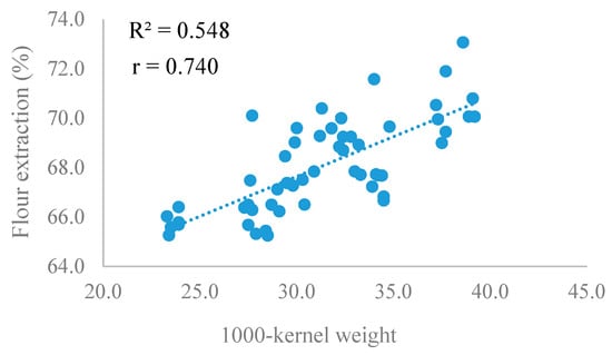 Grain texture affects wheat milling and end-use quality characteristics, which include milling yield, flour particle size and starch damage []. Wheat grain texture is determined by two genes, puroindoline a and puroindoline b, which are found at the Hardness (Ha) locus. Variations in the abundance and activity of these puroindolines have been shown to affect milling quality. Milling yield is important economically as higher flour yield is beneficial for the industry. Milling quality was determined by percentage extraction in this study. This parameter was lower in the glyphosate-treated samples compared to the control (Table 1). For the cultivar x treatment interaction, percentage extraction was somewhat lower in cultivar Glenn compared to cultivar Prosper; however, the cultivars showed different trends for the different glyphosate treatments. At the different locations, percentage extraction did not show a similar trend for the different treatments, although differences were observed between locations. That is, percentage extraction was not lowest in the control in all locations. Therefore, the data suggests that the effect of glyphosate on milling quality is also impacted by factors such as growing environment. In this context, it is somewhat difficult to elucidate why pre-harvest glyphosate application could lower percentage extraction in some locations, however it is possible that changes in the carbon flow caused by shikimic acid accumulation could affect grain weight, leading to lower extraction. The TKW showed a significant simple linear correlation with flour extraction rate (r = 0.740, p < 0.001), as represented in Figure 1, supporting that the inhibition of carbon accumulation in grain might result in low grain TKW and consequently, low flour extraction. Effects of glyphosate on starch-protein interactions could also be a contributing factor. However, further studies are needed to firmly establish this association.