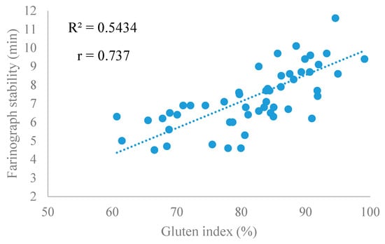 Manthey et al. [] reported dough mixing stability was increased, when glyphosate was applied at the soft dough or ripe stages. This could be due to changes in protein composition and chemistry that is caused by glyphosate through the inhibition of the shikimic acid pathway and the effects of glyphosate on carbon flow. This might be supported by a significant correlation between gluten index and farinograph stability (r = 0.737, p < 0.001), as shown in Figure 2.