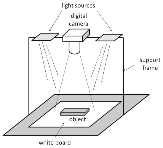Digital photo of potatoes was taken on a portable test stand, which was created for this research. This acquisition included a uniform, white 50 cm by 50 cm background plate on which the subject was placed. The light sources were a SMD LED light bar split in half. The camera was centrally mounted 50 cm above the plate on a beam and located next to the light source so that the exposure was vertically photographed from above (Figure 1). A Samsung WB30F camera (equipped with a 16 Mpix CCD matrix) was used. The selected camera was slightly modified (the trigger has been extracted and placed outside the camera housing using an extension cable) to facilitate photo acquisition. The photographs were taken with the sensitivity set to ISO 100, without the white balance adjustment and without the built-in flash lamp. The autofocus was used in the course of taking photographs of the potatoes. After the test shots, it turned out that it was not necessary to use a shadow-free tent, so the main series of tests was performed without using any light diverging device. Furthermore, that station design was deliberately chosen to imitate conditions when this part of evaluation will be done with a mobile device (e.g., a smartphone with a built-in camera, with typically a SMD LED diode as a light source).