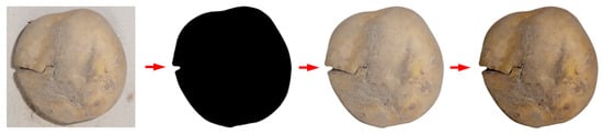 The issue of automation of potato tuber evaluation was based on an analysis of their surface images presented by Tian and Zhao []. The authors analysed issues related to the types of damage and the selection of effective methods for their identification. The benefits of using computer image analysis to automatically detect damage and measurements of tubers were also reported by Razmjooy’s research team. They presented an approach to using image information at the product sorting stage. The developed system was characterized by high accuracy and rate (depending on speed), which translated into the efficiency of the entire sorting module [].