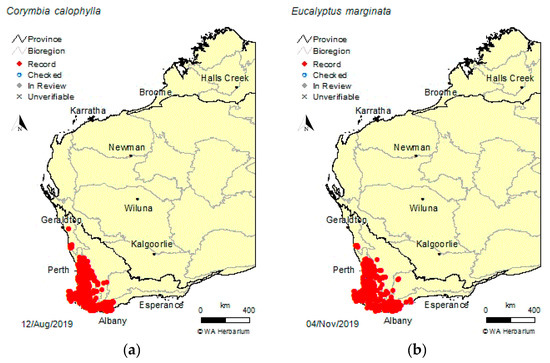 Geographic extent of Corymbia calophylla (a) and Eucalyptus marginata (b) [3].