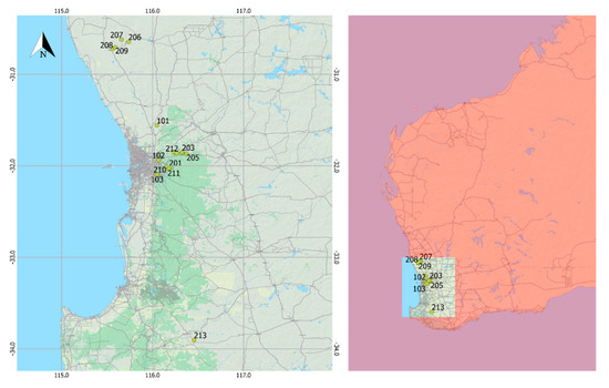 While most apiary sites were within 65 km of the capital city of Perth (Western Australia, −31.95 latitude 115.86 longitude), sites extended from as far north as Dandaragan (140 km north of Perth, −30.66 latitude 115.70 longitude) to as far south as Boyup Brook (230 km south-east of Perth, −33.83 latitude 116.38 longitude). The locations of the apiary sites are shown in Figure 2. All sites experience a warm temperate climate zone [10] and fall within the highly biodiverse South West Australian Floristic Region [11]. While all sites are within the same broad climatic region, the geographic extent of the sites means there is a range of annual weather trends within the study area, with the sites north of Perth being hotter and drier and the site south of Perth being cooler and drier (further inland than Perth). The mean annual and summer weather statistics for the three main areas are summarised in Table 2.