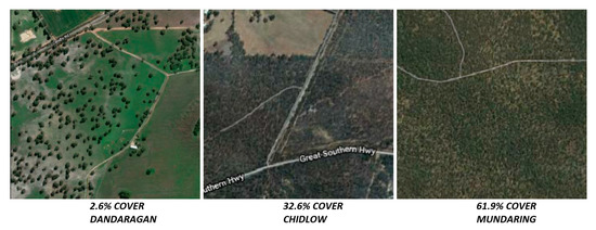 There was also a large range of mature tree canopy cover across the sites. Using the vegetation structure products produced by Auscover [12] in combination with the height range of mature, flowering Corymbia calophylla (marri) trees of 10–40 m [13], the percentage of mature canopy cover for the apiary sites ranges from as low as 2.6% (for a farm site near Dandaragan) to as high as 61.9% (for a forest site in the Beelu National Park, near Mundaring) with a median mature canopy cover of 32.6%. Examples of these canopy cover extents are shown in Figure 3.