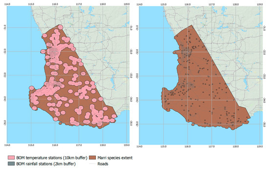 While the individual weather station measurements have a high degree of confidence, weather stations in the study area are widely spaced, with up to 38.9 km between apiary sites and the nearest weather station (Table 3). With the majority of the surveyed extent of the marri trees covering ~84,000 km2 [3], only ~11,000 km2 (or 13% of this area) has a temperature station within 10 km. This is shown spatially in Figure 4. The relatively sparse weather station network means that the extrapolation of temperature data to apiary sites may introduce some errors. Additionally, while a 10 km buffer from the rainfall recording stations covers 50% of the surveyed extent of marri trees, the spatial extent of rainfall events, particularly summer thunderstorms, can be much less.