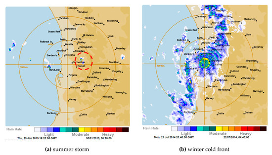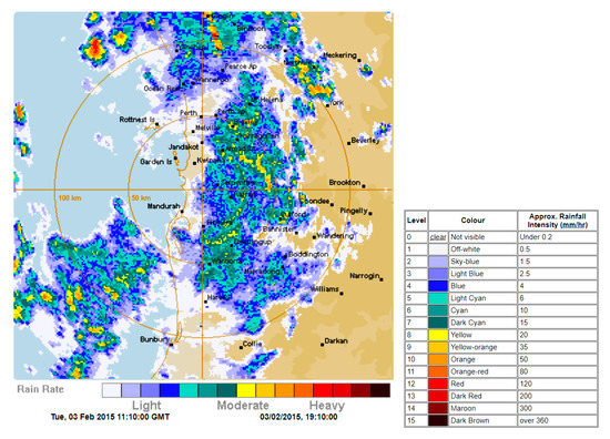 - The Weather Chaser. Perth Radar—128km Rain Rate. Available online: http://www.theweatherchaser.com/radar-loop/IDR703-perth-serpentine (accessed on 21 March 2019).