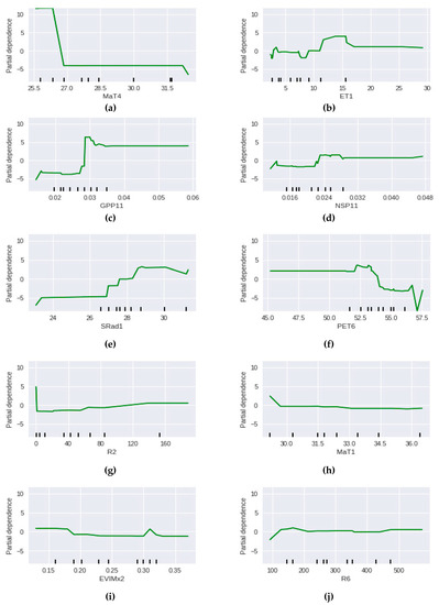 Partial dependence plots for 10 most important features (Gradient Boosted Regression). Refer to Table 4 for the feature acronym definitions. (a) Average maximum temperature for October to January (b) evapotranspiration for January (c) Gross Primary Productivity from March to January (d) Net Photosynthesis For March to January (e) Solar Radiation for January (f) Total Potential Evapotranspiration For August to January (g) rainfall from December to January (h) average maximum temperature in January (i) maximum Enhanced Vegetation Index from December to January (j) rainfall from August to January.