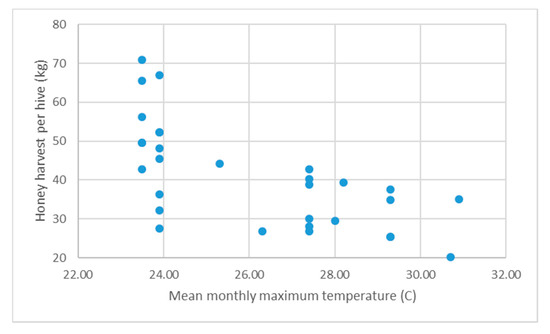 Mean monthly maximum temperature for November (MaT3) versus honey harvest weight.