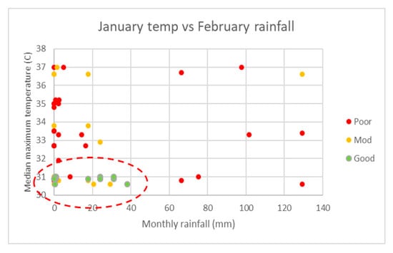 Rainfall immediately preceding and during the flowering period is one of the key factors in harvest quality (see Figure 8), with heavy summer rainfall events after flowering commences actually knocking stamen, and sometimes flowers, from the trees [40]. This presents an issue with the development of a predictive model as, even with good conditions in the lead up to the peak flowering period, a localised storm may downgrade a prospective harvest from a ‘good year’ to a ‘moderate year’ or even a ‘poor year’ in a matter of hours.