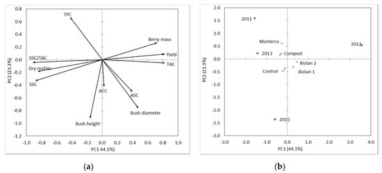 The PCA showed that the first principal component (PC1) explained 44% of the total variance in the data, and the second principal component (PC2) explained 23% (Figure 1). The PC1 and PC2 explained 68% of the variance in the data for both Figure 1a,b. PC3 explained 12% of the variance in the data in Figure 1a and described the negative correlation of ACC (data not presented in figure). PC1 was more related to the SSC, TAC, SSC/TAC, berry mass, dry matter and yield, whereas total PC2 was more related to the TPC, bush height and bush diameter in Figure 1a. TPC was positively correlated with 2011 in PC2; while yield, berry mass and TAC were positively correlated in PC1 and were highest in 2012.