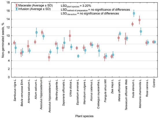 Infusions were slightly more effective than macerates, as 70% of them decreased the number of nonsprouted cauliflower seeds. The strongest were Equisetum arvense L. and Frangula alnus Mill. In both cases, the percentage of nonsprouted seeds was on average 4.80%. The macerate obtained from the roots of Inula elenium L. was the least effective in this respect as about 15.40% of unsprouted seeds were obtained in its case. Munir and Tawaha [40] showed that, apart from the extraction method, the morphological part of the plant from which the extract is obtained was also of significant importance. They observed that aqueous preparations obtained from Brassica nigra L. leaves limited the germination of lentil seeds to the greatest extent in relation to the extracts obtained from flowers, roots, and stems. Additionally, Filippo-Herrera et al. [41] showed a high effectiveness of seaweed extracts in treatment of mung bean seeds. Brown algae extracts were more effective than red algae extracts.