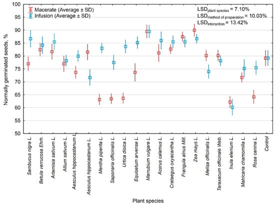 Normally sprouted seeds (%) depending on the species of plant from which the extracts were obtained and the method of extraction. SD: standard deviation, LSD: less significant difference.