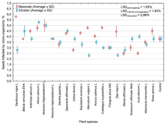 Seeds infected by microorganisms (%) depending on the species of plant from which the extracts were obtained and the method of extraction. SD: standard deviation, LSD: less significant difference.