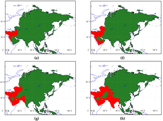 To process the simulations, temperature, relative humidity, and T. absoluta occurrence data from Asia were used (Figure 1). Previous works have highlighted the key role played by temperature and RH for the survival of T. absoluta both in the laboratory and in the field [37,47,48,49]. The vegetation variable, characterized by the normalized difference vegetation index (NDVI), was not taken into account in this study because it was demonstrated that NDVI did not really influence the choice of a location of T. absoluta during the process of invasion, unlike temperature and relative humidity [7]. Moreover, NDVI does not negatively affect the flying distance of T. absoluta during the invasion process. This is the same with the parameter quantity of tomato (main host plant) production per hectare, which mainly improves detection of potential invaded locations where environmental conditions are not suitable, without necessarily slowing down the flying distance [7]. Given that the main interest here was to explore if the path of invasion in Asia is the same as the one in Africa, only the climatic parameters were used. The temperature dataset was obtained from the WorldClim database (http://www.worldclim.org/current) (Hijmans et al., 2005); relative humidity data were downloaded on the Surface meteorology and Solar Energy (SSE) website (http://eosweb.larc.nasa.gov/sse/). However, T. absoluta occurrence data in Asia were collected from different scientific publications [16,17,18,19,20,21].