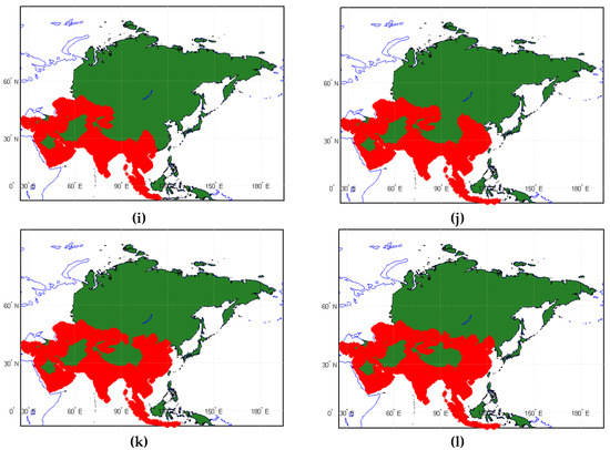The invasion of Tuta absoluta in Asia. The simulation is made for 25 years considering the temperature and relative humidity as parameters. Locations in green are those susceptible to being invaded; locations in red are those invaded by the spread of T. absoluta. (a) 1 Year; (b) 4 Years; (c) 6 years; (d) 8 years; (e) 10 years; (f) 12 years; (g) 15 years; (h) 17 years; (i) 19 years; (j) 21 years; (k) 23 years; (l) 25 years.