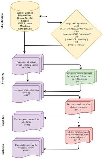 The documents were downloaded and screened for a total of 173 identified documents from selected scholarly sources. Only 78 documents remained after removing 95 documents in preliminary screening stage. An additional 35 relevant documents were found using snowball sampling from the bibliography of the identified documents, which were added to the collection of 78 documents. Snowball sampling is a method of survey used here to locate unidentified articles by the references from initially identified documents. Thus, a total of 113 (78 + 35) documents were selected for abstract evaluation. A total of 32 documents were removed after a careful evaluation of 113 abstracts. Then, only 81 documents were selected for eligibility checking, from which 19 documents were excluded. This study excluded review articles, articles with no use of remote sensing data, and articles primarily focused on non-flood crop damage. In addition, some articles were removed because of their primary focus on broader aspects of disaster management including monitoring, warning, and mitigation. Finally, a total of 62 empirical studies were selected for detailed analysis.