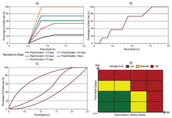 Figure 3 illustrates conceptual examples of stage–damage relationship for flood crop loss assessment. The shape of stage–damage curve widely varies with crop types and geographic locations. Figure 3a represents the idea to have both flood depth and duration in continuous stage–damage function. The shape of the curve may vary with the crop-growing seasons such as vegetative stage, reproductive stage, maturity stage, and ripening stage [66]. A piecewise curve can also be utilized as a stage–damage function where loss percentage varies with the ranges of flood depth (Figure 3b). The utilization of a pricewise curve is very similar to the threshold-based application of flood parameters. There were a variety of shapes, including exponential, quadratic, and spline, which were also utilized as a stage–damage function for crop loss assessment. Most of the stage–damage curve used a certain water depth threshold as the ceiling, any water depth above that threshold indicates total crop loss (Figure 3a–c). Figure 3d represents a tabular loss assessment approach where each of the flood intensities is categorized into a finite number of classes. The level of crop damage can be assessed based on the level of two or three flood intensity parameters. The stage–damage curve should be crop type and geographic location specific to get a better result in crop loss assessment.
