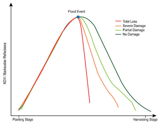 Another interesting approach is the utilization of machine learning techniques (e.g., supervised, unsupervised) on remote sensing time-series images for crop damage assessment. The idea here is to capture the change in crop condition profiles because of flooding. Machine learning or data mining algorithms can detect such change from the time series (e.g., image or NDVI) of pre- and post-event multidate data. The degree of damage is directly related to the degree of deviation from normal crop condition profiles. Figure 4 shows a conceptual diagram of the degree of crop damage based on time-series image bands or NDVI. An unsupervised clustering approach can be used to assess the degree of damage based on the multidate image stack. Chowdhury and Hassan [102] utilized RADARSAT time-series data to assess the degree of damage in rice fields using ISODATA clustering. A similar concept was used by Pantaleoni [86] for the damage assessment of corn and soybean in Indiana using Landsat time series. Ahmed et al. [15] utilized ISODATA clustering approach on MODIS NDVI time series instead of remotely sensed image bands for crop damage assessment in Bangladesh. They utilized NDVI time series with the basic assumption that crop NDVI may decline in flood-affected pixels. Although these studies used clustering approaches, the basic assumption is similar to the loss assessment based on the change in VIs. Lee and Lee [57] used the maximum likelihood supervised classification technique for the rice damage assessment using pre- and post-flood RADARSAT data. It is observed that SAR backscatter value is usually decreased from the flood-affected crop field. They collected ground truth on damage categories (e.g., damaged, recovered, and no damage) through field surveying to train the supervised classification model. Supervised learning algorithms require training data to train classification models. Training sample collection on crop damage is not only time- and cost-inefficient but also prone to subjective labeling. Thus, the unsupervised approach may be advantageous for rapid assessment. Case studies which utilized machine learning approaches reported the degree of damage on a subjective scale. Quantitative loss can be estimated by incorporating historical yield loss information associated with the degree of damage. Machine-learning-based assessments are advantageous because these approaches can support rapid damage assessment without relying on historical data.