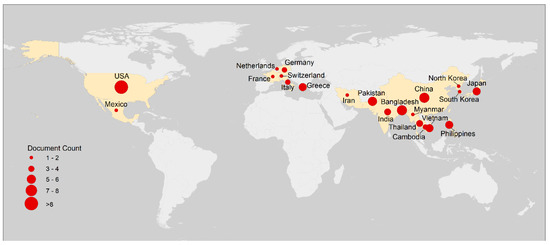 The selected case studies covered 21 countries from three continents: North America, Europe, and Asia. Figure 5 shows the spatial distribution of the selected case studies. Almost two-thirds (64%) of the studies were from Asia (40 studies). An equal number of studies (11 each) were from Europe and North America. Case studies from Asia are mostly located in the South and Southeast Asian countries. Although countries in the Amazon Basin are flood-prone, no study on remote-sensing-based flood crop loss assessment is found from this region. One possible reason could be that most of the publications from the Amazon region are in other languages than English. Similarly, many countries in East Africa and parts of Australia are highly vulnerable to floods, but no case studies were identified from these areas.