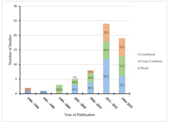 Selected case studies were categorized based on information utilization in flood crop loss assessment. Many studies relied only either on flood intensity information [49,64,74] or crop condition profiles [16,46,102]. Some studies also utilized both flood intensity and crop condition profiles for damage assessment [17,31,54]. The selected case studies were published between 1987 and 2019. Figure 6 shows the temporal pattern of selected case studies based on three different approaches. Only six (10%) studies were published before 2000, which indicates that the utilization of remote sensing data in flood crop loss assessment became popular mostly after 2000. The number of studies in this domain was significantly increased after 2010 (Figure 6).
