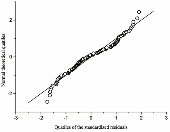The normal quantile–quantile plot of the standardized residuals of the constructed sorghum–sudangrass hybrid yield prediction model.