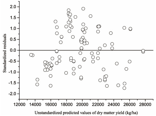 The scatter plot of standardized residuals against predicted values of the response variable from the constructed sorghum–sudangrass hybrid yield prediction model.