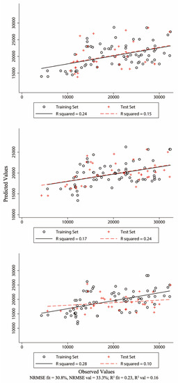 The points in the Q–Q plot (Figure 2) are arranging well on the 45-degree line. At the same time, the points around the zero line do not present a particular pattern in the scatter plot (Figure 3). The results of the residual diagnostics from the two plots confirmed the fitness of the model. The results of the 3-fold cross-validation (Figure 4) were segregated into training and test sets in each subfigure. The average coefficient of determination (R2 fit) and the average NRMSE (NRMSE fit) of the 3 training sets were 0.23 and 30.8%, respectively; while for the 3 test sets, the average coefficient of determination (R2 val) and the average NRMSE (NRMSE val) were 0.16 and 33.3%, respectively. These results indicated that the accuracy of this model was at the common level.