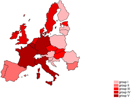 The fifth typological group was composed of France, Italy, Germany, and Belgium. The characteristic feature of this cluster was a quite high level of the assets-to-land ratio compared to other groups. This can be explained by a medium area of agricultural land accompanied by a widespread use of production machinery and a high value of fixed assets. This, in turn, was related to a moderate area of agricultural land per FTE. Compared to other typological groups, the value share of livestock in fixed assets was low and the number of dairy cows was at a medium level. Livestock density was average in that cluster; this can be explained by the area of agricultural land being at an average level, as mentioned earlier.