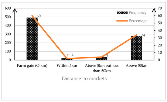 The participation of farmers in markets depends on the available markets that farmers can select. Market selection involves the process of farmers choosing and selling their produce in different marketing outlets []. The decision of farmers to select a particular market/market channel is complex, influenced by many factors conditioned on the farmer, including the volume of the produce, their location, information, the type of the product, and market prices. Other factors include physical access and distance to the markets, farm size, farm assets, age, income, long term investment, level of commercialization, transport, and infrastructure [,,,].