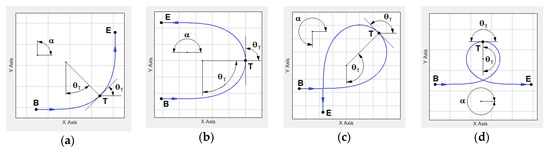 Individual paths differ in the angle α between the tangents in the initial and terminal points. The paths for which the angle α is π/2, π, 3π/2, and 2π were analyzed whereby it is possible to form a path for any angle α. In the case of the path called “half of lambda” (Figure 3a), the angle between the tangents is α = π/2 (angle of tangent to the curve at the point T is θT = π/4). For the path presented in Figure 3b called “half of chi” the angle between the tangents α = π but θT = π/2. The path in Figure 3c is called “rho”. The angle between the tangents for this path is α = 3π/2, but θT = 3π/4. The path in Figure 3d is called “omega”. In the case of this trajectory the angle between the tangents α = 2π but the tangent to the curve angle θT = π in the midlength of total motion trajectory.