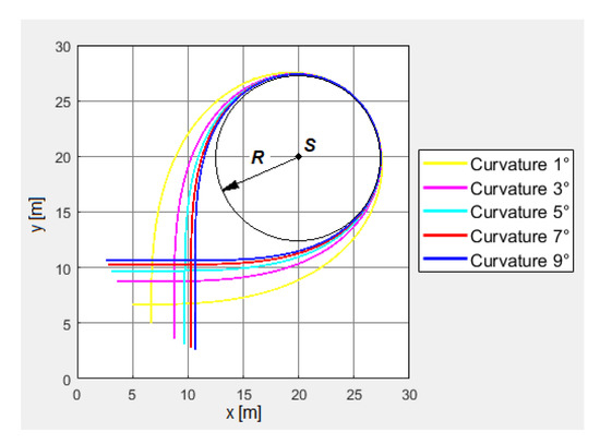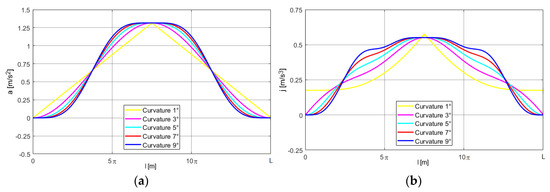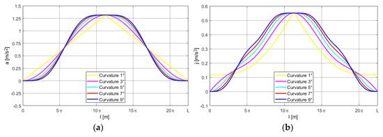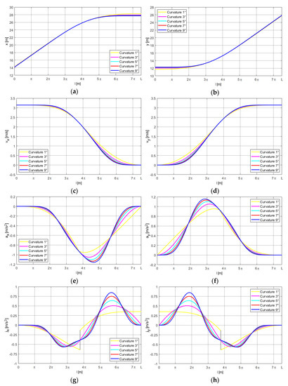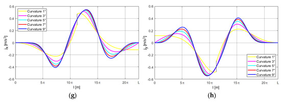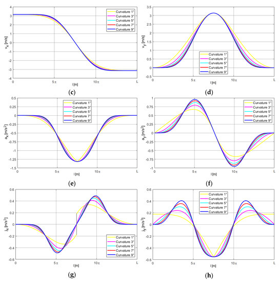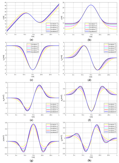 The simulation results are presented in the form of courses of kinematic parameters with regard to displacement l. Figure 4 presents the “half of lambda” (HoL) motion trajectories for the curvatures described by the linear function as well as the third, fifth, seventh, and ninth degree polynomials.