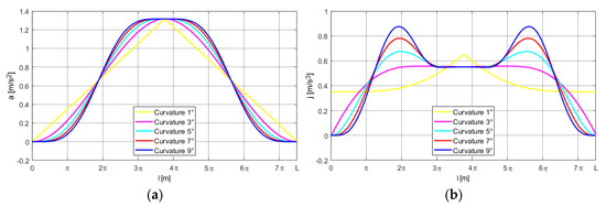 Analyzing the courses of acceleration and jerk it was found that the linear curvature causes discontinuity in the course of jerk components (Figure 5g,h, Figure 8g, Figure 11g,h and Figure 14h). The exceptions are only the jerks along the axis y for the path HoC (Figure 8h) and those along the axis x for the path OMG (Figure 14g). On the other hand, considering the courses of both acceleration and jerk components, the largest absolute values of their local extremes were found using the curvature described by the polynomial 9°. These values decrease with the decreasing degree of the polynomial describing the curvature. Thus, the trajectory, whose curvature is designated by the polynomial 3°, is the most favorable taking the motion kinematics into account.