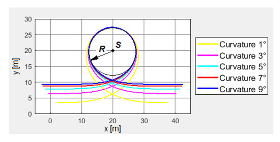 Application of the curvature described by the polynomials of increasingly higher degrees results in the step “clinching” of path shape which is particularly evident for the paths HoC, RHO, and OMG whereby the open path HoC becomes “narrower” and the closed ones RHO and OMG “tighter”. The greatest differences were found for the trajectories whose curvature is described by the 1–5 degree polynomials and the smallest ones for the 7 and 9 degree polynomials (Figure 4, Figure 7, Figure 10 and Figure 13). In the case of the curvature described by the polynomial 9° one can find lengthening of the initial and terminal parts of the segment whose deviation from the straight line is insignificant (deviation from the rectilinear segment is 5 mm for about 7.5 m). This fact is of significant importance as it enables inclusion of these segments into the working area.