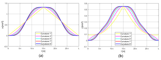 Due to the fact that velocities, accelerations, and jerks are determined as the first, second, and third displacement derivatives in relation to time, the simulation was made in the time domain. Assuming the constant maximal velocity of motion along the path vmax and introducing the substitution l = vmaxτ and dl = vmaxdτ into relation (3), rectangular coordinates of any point of the single transition curve in the function of time t are obtained from: