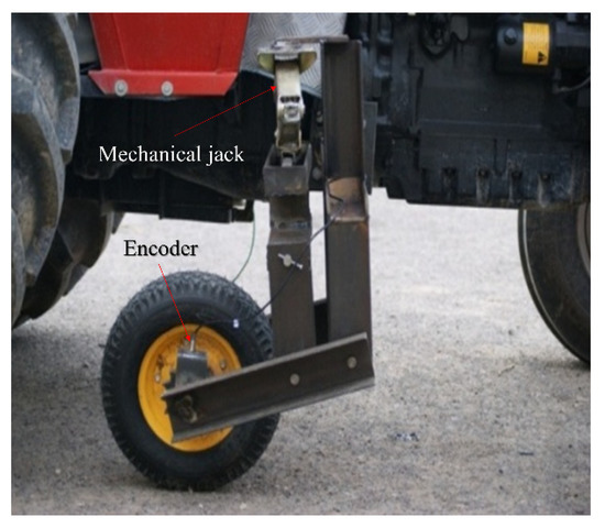 In this research, a fifth wheel consisting of a 39 cm diameter rubber wheel (Figure 2), a mechanical jack for height control, an induced proximity sensor (PR12-2 DN Model, Autonix Co., Busan, Republic of Korea) for rotation counting, and a pulse meter for rotation measurement were used to measure the forward speed of the tractor.