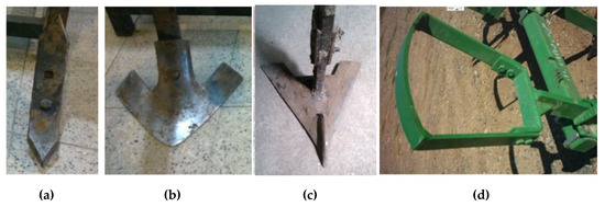(a) Chisel blade (b) sweep blade, (c) high-speed cultivator blade, and (d) crescent cultivator blade.