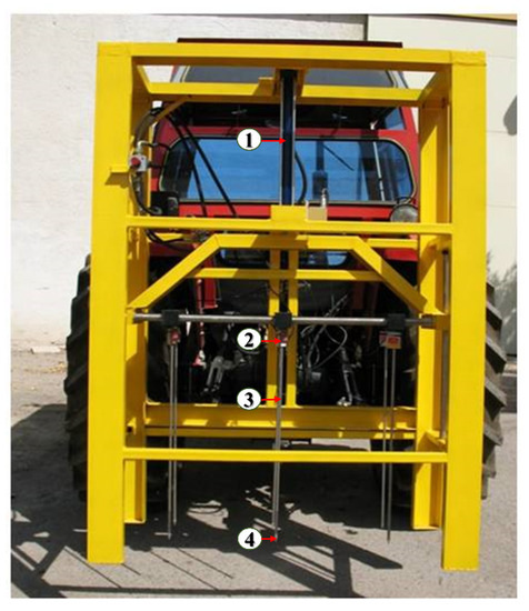 In order to measure the soil cone index values in the test plots, a cone penetrometer was mounted behind the tractor [23]. The penetrometer was mounted to the three-point hitch of tractor which was equipped with multiple penetration rods that could measure the soil cone index values at various points and depths (Figure 4). The main part of the penetrometer is a cone-shaped end-tool with the cross-section of 133 mm2 and the 30° point angle which is added to the end of a 95 cm long rod. The rod attached to the cone tip is pushed into the soil using the hydraulic force generated by the hydraulic jack.