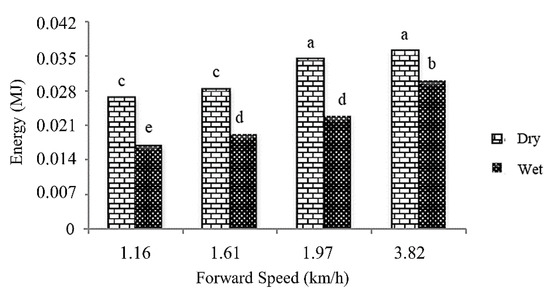 As can be seen from Figure 5 and Figure 6, in both dry and wet soil conditions, there was a significant increase in the forward speed and energy requirement with the draft force. There was only no significant relationship between the forward speeds of 1.16 and 1.61 km/h in the dry soil conditions and 1.61 and 1.97 km/h in the wet soil conditions, respectively. The maximum amounts of draft force and energy requirement at the speed of 3.82 km/h were 296.702 N and 0.03708 MJ in the dry conditions, respectively. Horn [27] reported that as the soil moisture content decreases due to the soil drying and hardening, the draft force increases. Therefore, the soil strength increases by increasing the cone index [27].