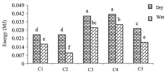 As can be seen from Figure 7 and Figure 8, as the moisture content of the soil increases, the draft force and energy requirement of all the tools significantly change under both the test conditions. There was no significant difference between C4 and C3 and also between C1 and C2. In terms of draft force and energy requirement in both dry and wet conditions, C4 and C3 were in the higher group because of the special geometrical shape and larger contact surface with the soil. The highest average draft force and energy requirement for C4 were obtained in the dry conditions as 339.36 N and 0.042408 MJ, respectively. The lowest values were obtained for C2 as 133.8 N and 0.009216 MJ. The reason for the differences can be attributed to the fact that the soil cohesion-tool and the soil friction-tool are the two main components of soil resistance to the tool movement, and the soil moisture content influences both the factors.