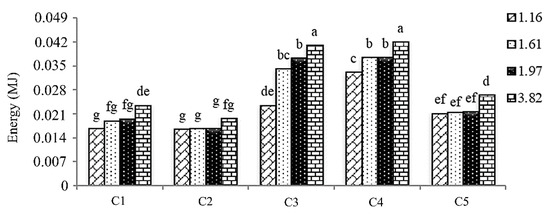 From Figure 9 and Figure 10, it can be seen that there is a significant increase in the draft force and energy requirement of all the tested tools with increasing the forward speed. The reason for this significant difference can be attributed to the difference in the soil failure by different tools at different operating speeds. This result is consistent with the findings of researchers such as Al-Janobi and Al-Suhaibani [21] and Grisso et al. [28]. There was no significant effect on the draft force and energy requirement in C4 between the speeds of 1.61 and 1.97 km/h, in C2 between 1.61 and 1.97 km/h, in C1 between the speeds of 1.16 and 1.61 km/h, and in C5 between the speeds of 1.16, 1.61, and 1.97 km/h, respectively. The average maximum draft force and energy requirement at the forward speed of 3.82 km/h for C4 were 344.98 N and 0.043128 MJ, respectively. Because, the highest mean areas of the profile created by the cultivators was related to the crescent cultivator (C4) as is explained in Section 3.2.6.