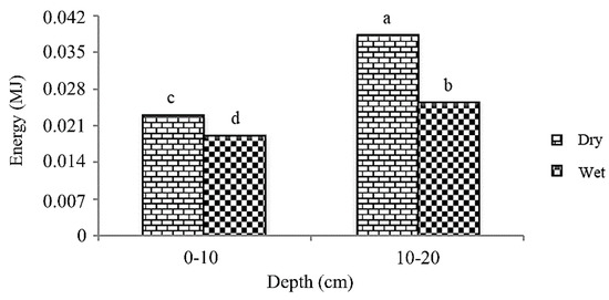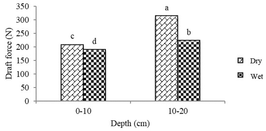 Figure 11 shows that by increasing the tillage depth in both soil moisture contents, the draft force and energy requirement significantly increased. Also, by increasing the moisture content at all depths, the amount of draft force is significantly reduced. The reason for these results is that as the depth increases, the mechanical strength increases, and as the soil moisture content increases to a certain degree, the mechanical strength of the soil is reduced and therefore, less failure force is required (Figure 12). Also, the effect of soil moisture content on draft force and consequently energy requirement, could be due to the effect of soil moisture content on area of profiles created by cultivators which is investigated in Section 3.2.2. This result is consistent with the findings of researchers such as Khalilian et al. [29] and Summer et al. [30]. The average maximum draft force and energy requirement in dry soil at the 10–20 cm depth were 313.534 N and 0.039204 MJ, respectively, and the lowest values were 189 N and 0.019512 MJ in wet soil at the depth of 0 to 10 cm, respectively.