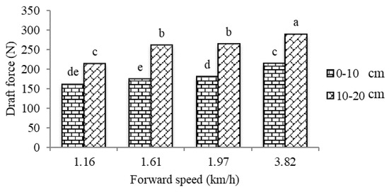 Effect of forward speed at the moisture on draft force of cultivators (letters a-e indicate statistical significance).