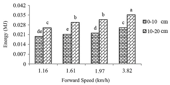 Figure 13 and Figure 14 show that at all forward speeds, the average draft force and energy requirement for the tillage significantly increase with increasing the tillage depth. However, no significant effect was observed for the depth of 10–20 cm between the speeds of 1.61 and 1.97 km/h. The highest average draft force was obtained at 10–20 cm and 3.82 km/h as 288.5065 N. Also, the lowest average draft force was obtained at the 0–10 cm depth and speed of 1.16 km/h as 160.979 N. The highest and lowest mean values were obtained at the speeds of 3.82 and 1.16 km/h with the values of 0.036072 and 0.020124 MJ, respectively.