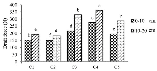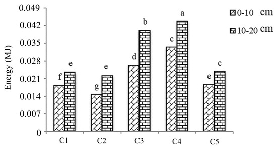 From Figure 15 and Figure 16, it is found that by increasing the working depth, the draft force and energy requirement of all the tools significantly increase. At the working depths of 0–10 and 10–20, no significant effect was observed between C2 and C1. The highest average draft force was obtained at the depth of 10–20 as 358.592 N. The lowest average draft force was obtained at the depth of 0–10 as 149.42 N. C4 with an average energy requirement of 0.01244 kWh had the highest amount of energy, and C2 with the average energy of 0.014976 MJ had the lowest amount of energy. Perumpral et al. [15] compared the actual values of tensile strength of narrow tools with the current models and showed that in all the tools, as the working depth increases, the draft force and energy requirement increase, and thus, they justified this factor that as the depth increases, the draft force and energy consumed during the operation will increase because of the increase in the failure level as well as increased volume of the disturbed soil.