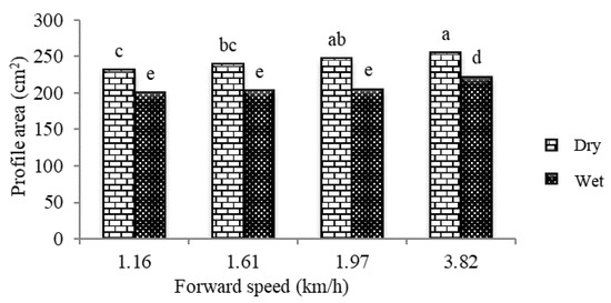 As can be seen from Figure 18, the profile area increases in both dry and wet conditions by increasing the forward speed. The highest mean value of the area obtained from the profiles was 254.62 cm2 related to the dry conditions and forward speed of 3.82 km/h, and the lowest mean value of the area obtained for the wet conditions was 199.6 cm2 and forward speed of 1.16 km/h. As reported by Manuwa and Ademosun [26], when the soil moisture content decreases, the soil particles and masses are bonded with a higher cohesion force, and thus, more force is required for the failure. Also, reducing the soil moisture content increased the maximum soil shear width and maximum soil throw width, which also increased the force and energy consumed during the operation.