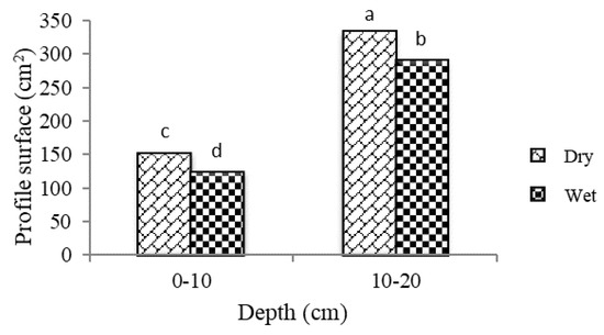 Figure 19 shows that there was a significant increase in the profile area as the moisture content decreases. In this case, it can be noted that in the wet conditions, the components have a ductile form and tend to be less fractured and scattered than the dry soil. This is due to the moisture and cohesion between the soil particles. The highest average area obtained from the profiles was 434.813 cm2 in the dry conditions and C4 and the lowest one in the wet conditions and the cultivator with a chisel blade and L-shaped shank as 57.94 cm2.