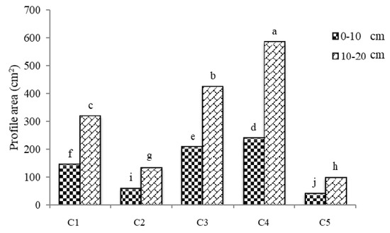 As can be seen in Figure 23, all the tools and equipment used in the research showed a significant increase in the cross-sectional area of the profiles with increasing the working depth. However, some of the used tools had a greater effect on increasing the area of profiles with the increased depth because of the greater shape and contact surface when working with soil. The highest and lowest mean areas of the profile created by the cultivators were related to C4 at the 10–20 cm depth as 584 cm2 and C5 at the 0–10 cm depth as 41.563 cm2.
