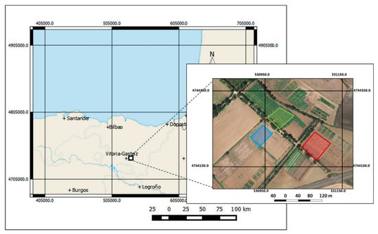 Location of the three field experiments in Arkaute, Araba, Basque Country, northern Spain. The field experiment in 2015 was carried out in the red field. The field experiment in 2016 was carried out in the blue field. The field experiment in 2017 was carried out in the green field.
