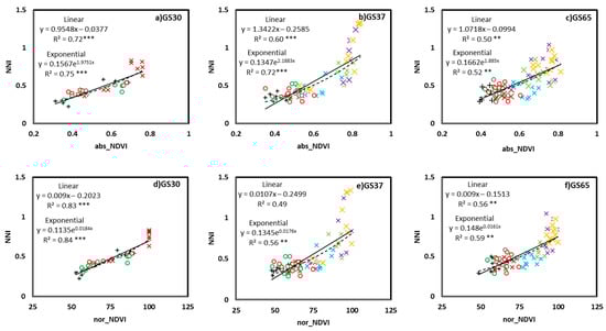 Relationship between the NNI (Nitrogen Nutritional Index) and abs_NDVI values at GS30 (a), GS37 (b), and GS65 (c) and between the NNI and nor_NDVI values at GS30 (d), GS37 (e), and GS65 (f). Two models were fitted: linear, solid line; exponential, dashed line. **, *** Significant at 0.01 and 0.001 probability levels, respectively. +, 0N; ×, 40N + 0N; ×, 40N + 40N; ×, 40N + 80N; ×, 40N + 120N; ×, 40N + 160N; o, DS + 0N; o, SM + 0N. abs, absolute values; nor, normalized values; NDVI, Normalized Difference Vegetation Index.