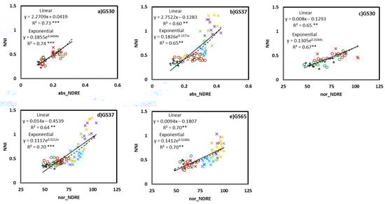 Relationship between the NNI (Nitrogen Nutritional Index) and abs_NDRE values at GS30 (a) and GS37 (b) and between the NNI and nor_NDRE values at GS30 (c), GS37 (d), and GS65 (e). Two models were fitted: linear, solid line; exponential, dashed line. **, *** Significant at 0.01 and 0.001 probability levels, respectively. +, 0N; ×, 40N + 0N; ×, 40N + 40N; ×, 40N + 80N; ×, 40N + 120N; ×, 40N + 160N; o, DS + 0N; o, SM + 0N. abs, absolute values; nor, normalized values; NDRE, Normalized Difference Red Edge Index.